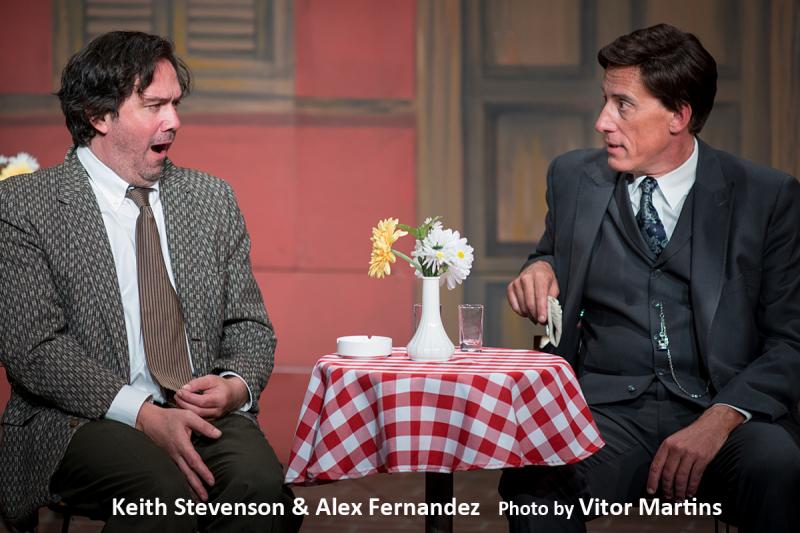 Curtain rises on an outdoor café in a quaint provincial French town thoroughfare. (Kudos to set designer David Mauer). All the townsfolk enter and interact in their everyday goings-on. Jean arrives to the café to meet his friend Berenger. Alex Fernandez oozes the oily self-absorbness of Jean, a prim, preening fussbucket. A fast-talker with a high opinion of himself, Jean reprimands Berenger on his sloppy attire, his drinking, his everything. Makes one wonder why Berenger would be friends with such an overbearing, condescending bully. Keith Stevenson commands the stage as Berenger, the slacking copy editor, the empathetic Everyman who’s guilty of every accusation Jean makes. Stevenson as the unassuming Berenger more than holds his own against the bombastic rantings of Fernandez’ Jean. Stevenson’s yin to Fernandez’ yang. Berenger’s Robin to Jean’s Batman. These two work well off each other.
