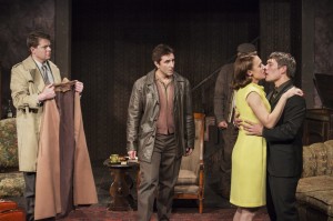 June 5, 2015“Why don’t you shut up, you daft prat?” says Lenny (Jason Downs, resembling young Malcolm McDowell) to his father, Max (Jude Ciccolella), in Guillermo Cienfuegos’ top-flight revival of Harold Pinter’s 1965 comedy The Homecoming at Pacific Resident Theatre. He doesn’t say it in a moment of fury. It’s just part of the East London family’s nonchalant repartee, spoken while reading a newspaper on a sofa. Dad calls all of his sons “bitches.” He instantly insults his English daughter-in-law, Ruth (Lesley Fera), upon her arrival with her hubby, who is Max’s prodigal son/professor of philosophy (Trent Dawson), visiting from their U.S. home.