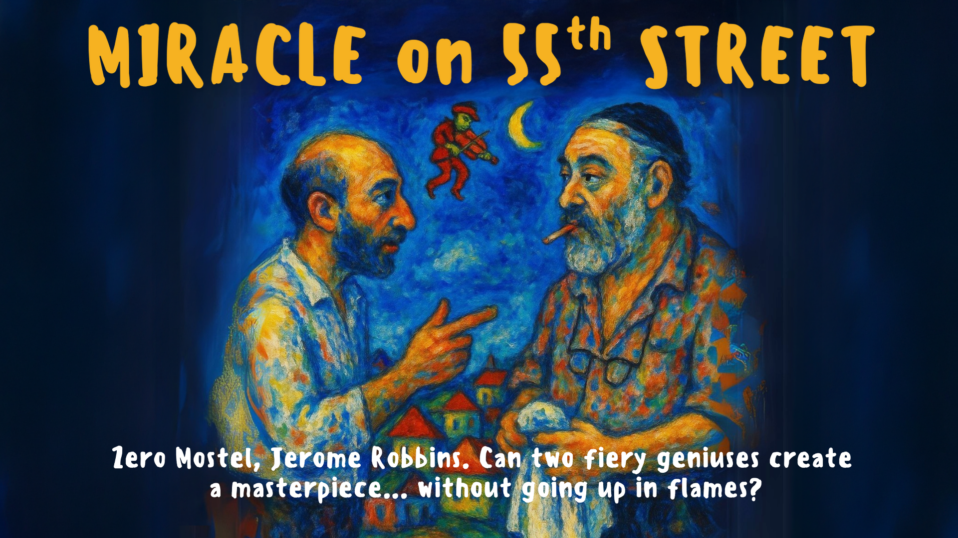 It’s 1964. The United States is in the fearful shadow of the McCarthy hearings. Homophobia and antisemitism are everywhere. And in a Broadway rehearsal room, the brilliant, battling artists Zero Mostel and Jerome Robbins must work together to create what will become one of the great American musicals, Fiddler on the Roof. How can they collaborate if they can’t stand each other? And what is the true cost of creating a masterpiece?