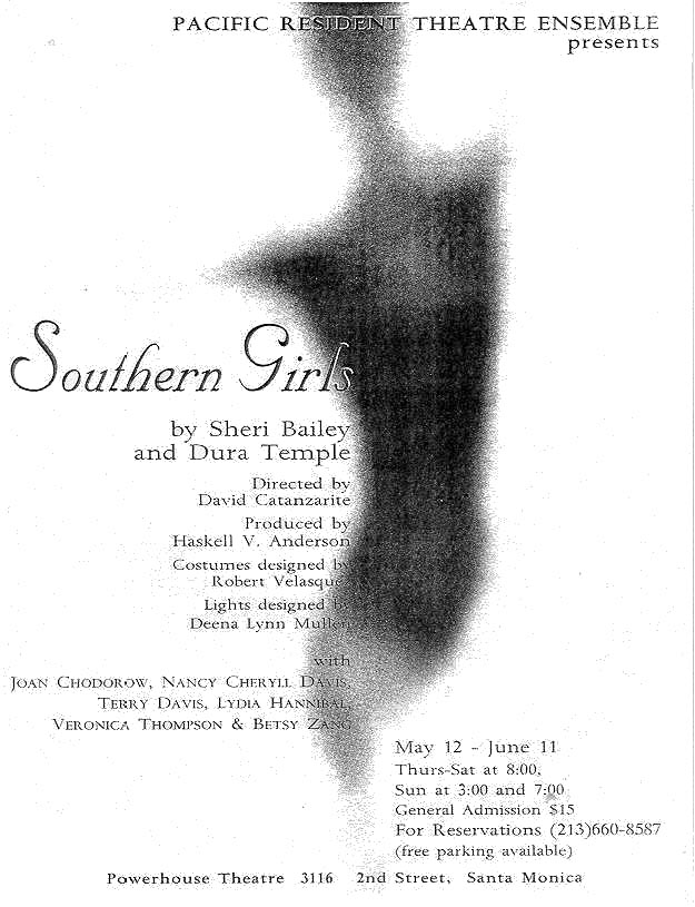 A Note From the PlaywrightsThe recent tragedy in Oklahoma City is a grim reminder of how ignorance can manifest itself in silence. The eyes of innocent children, too stunned to cry, silently voiced the universal question: “Why?”. We wrote “Southern Girls” from hearts like those – those of the little girls we once were, growin gup in the south, who witnessed injustice. Understanding begins with discussion. We hope that our play will improve communication. As Zora Neal Thurston once wrote :Ships at a distance have every one’s dreams on board”. Our dream is a world in which we hope never again to have to look into the shocked eyes of injured children and wonder “why”? [/one_half_last]